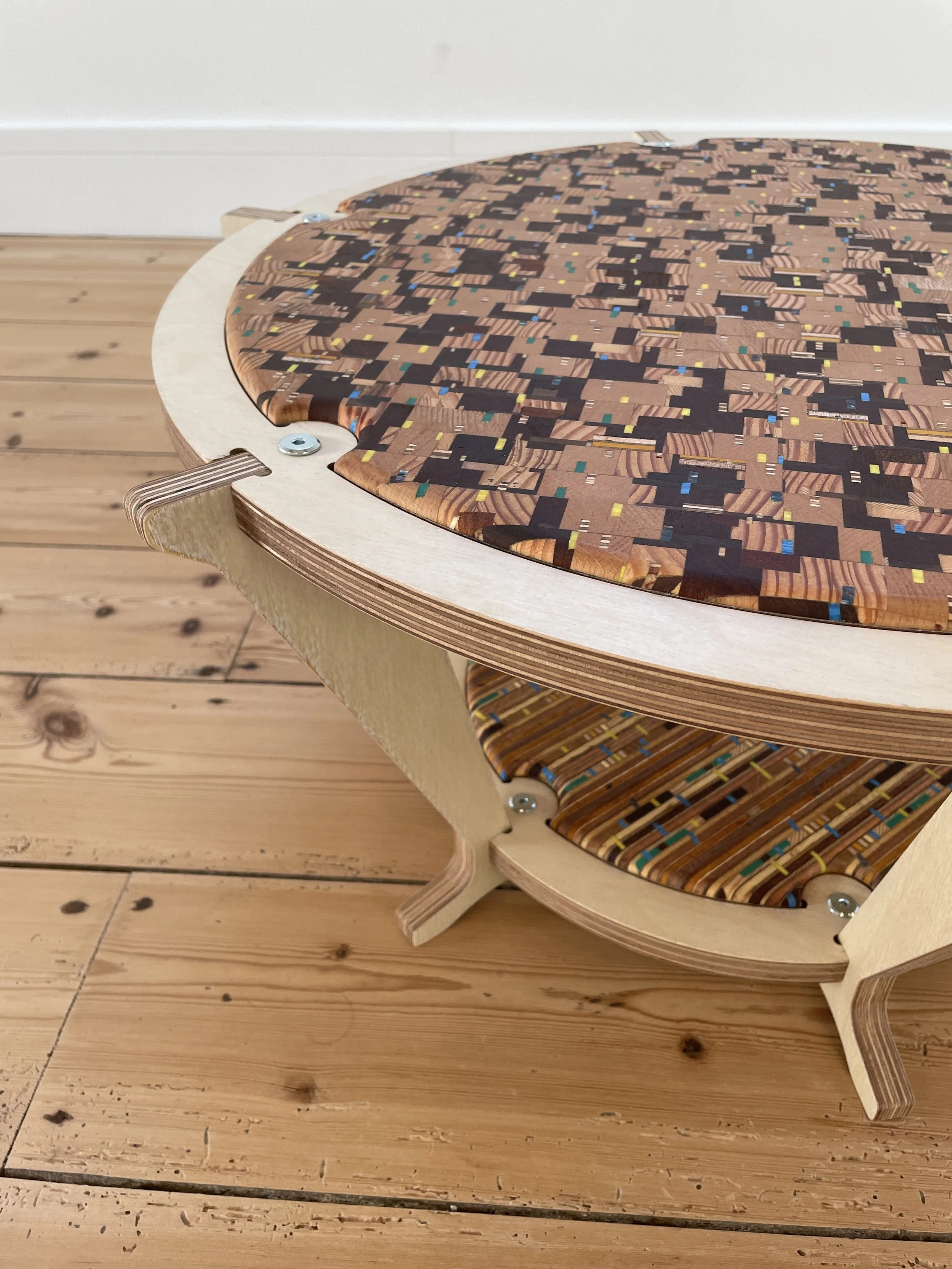 Materials: Birch Ply, reclaimed shuttering ply, reclaimed acrylics and mixed end grain timbers.