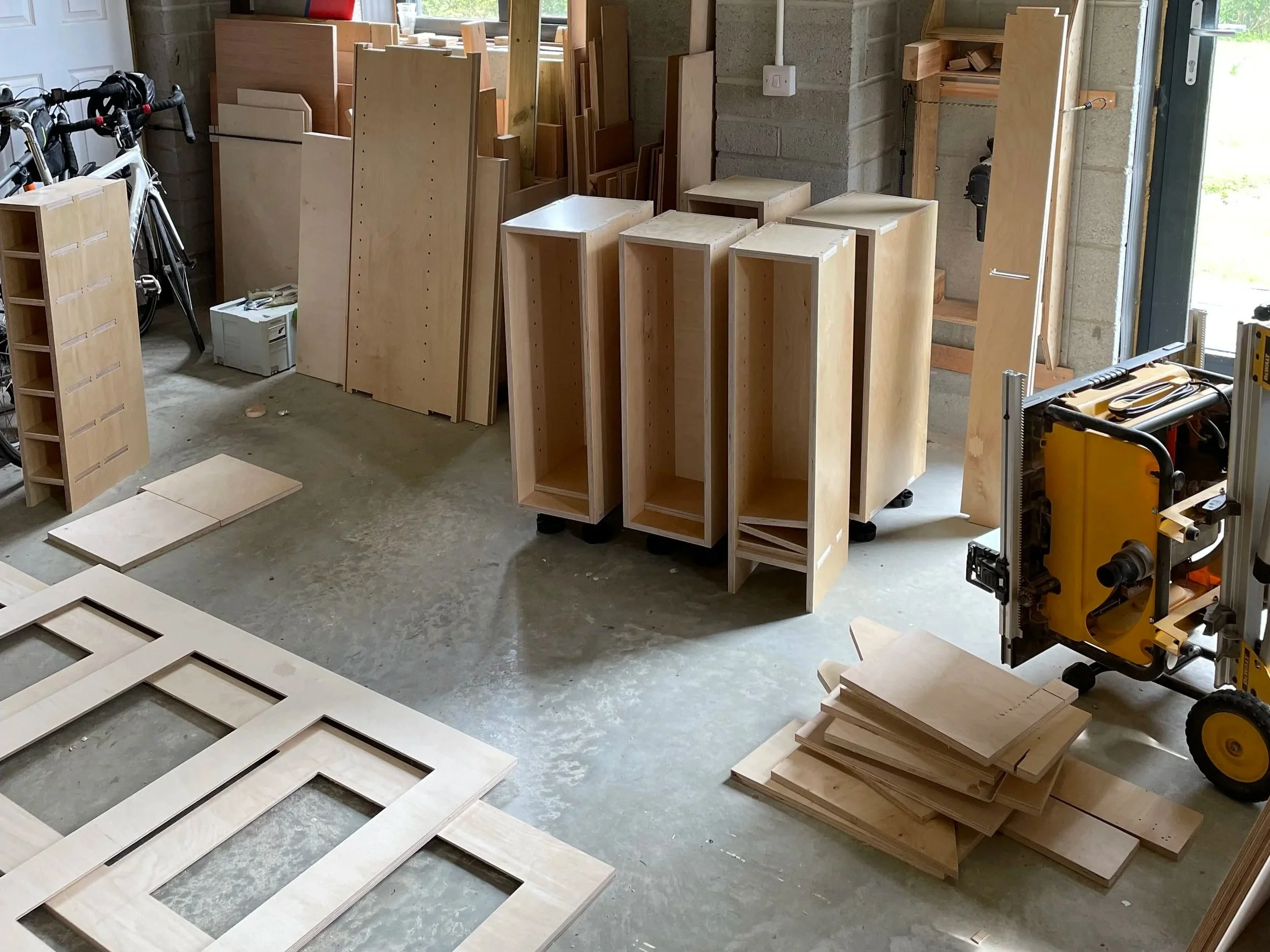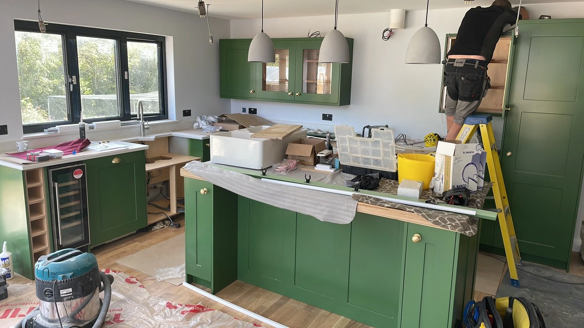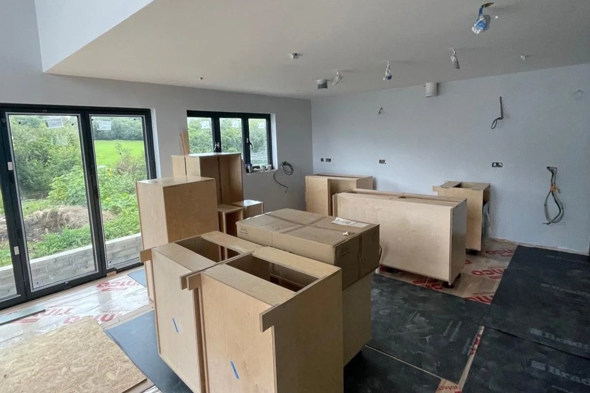 At one stage, the completed kitchen had to be temporarily stored on-site before installation could begin — requiring careful handling and planning.