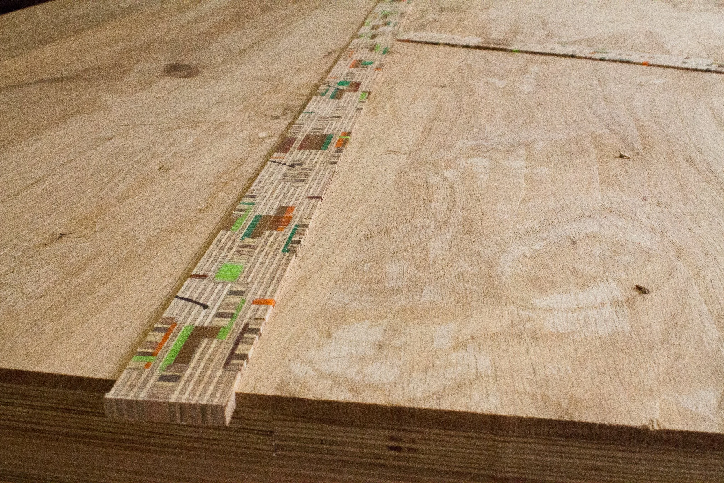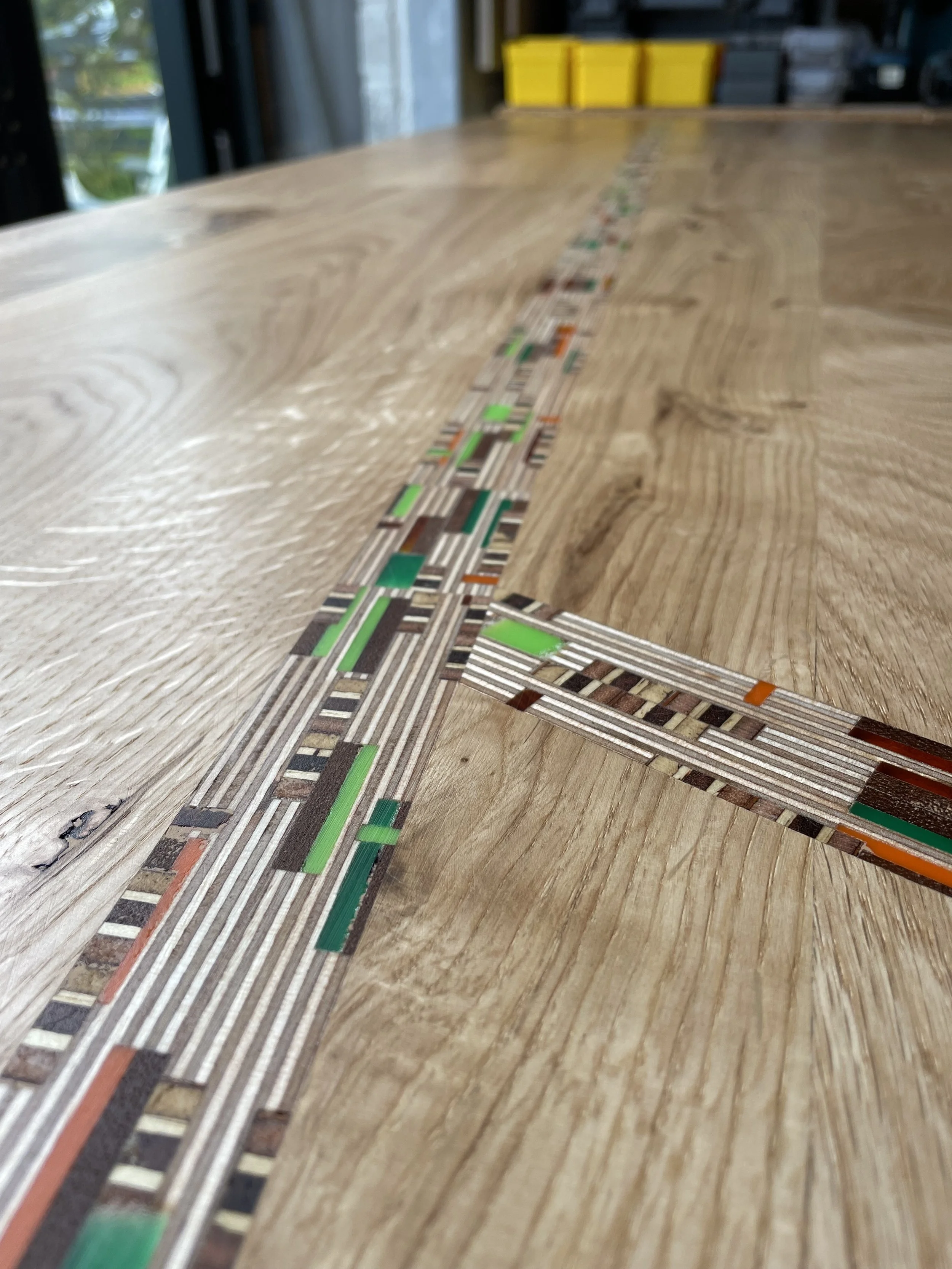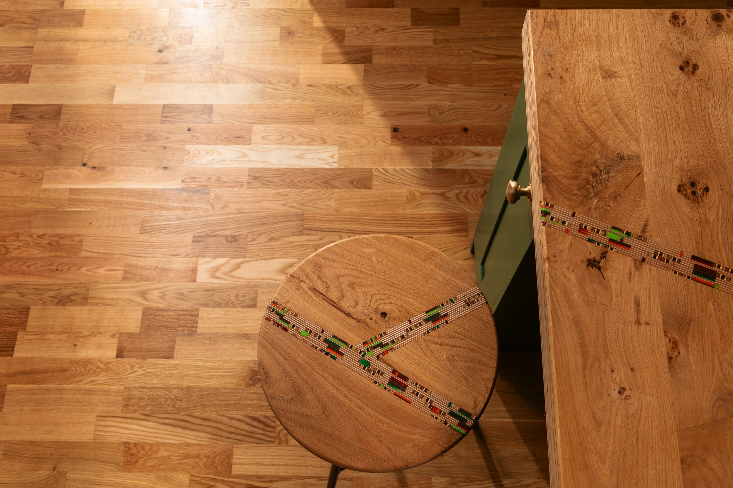Rather than overwhelming the space, the marquetry was designed as a continuous linear motif — a stripe that appears across multiple elements of the project.