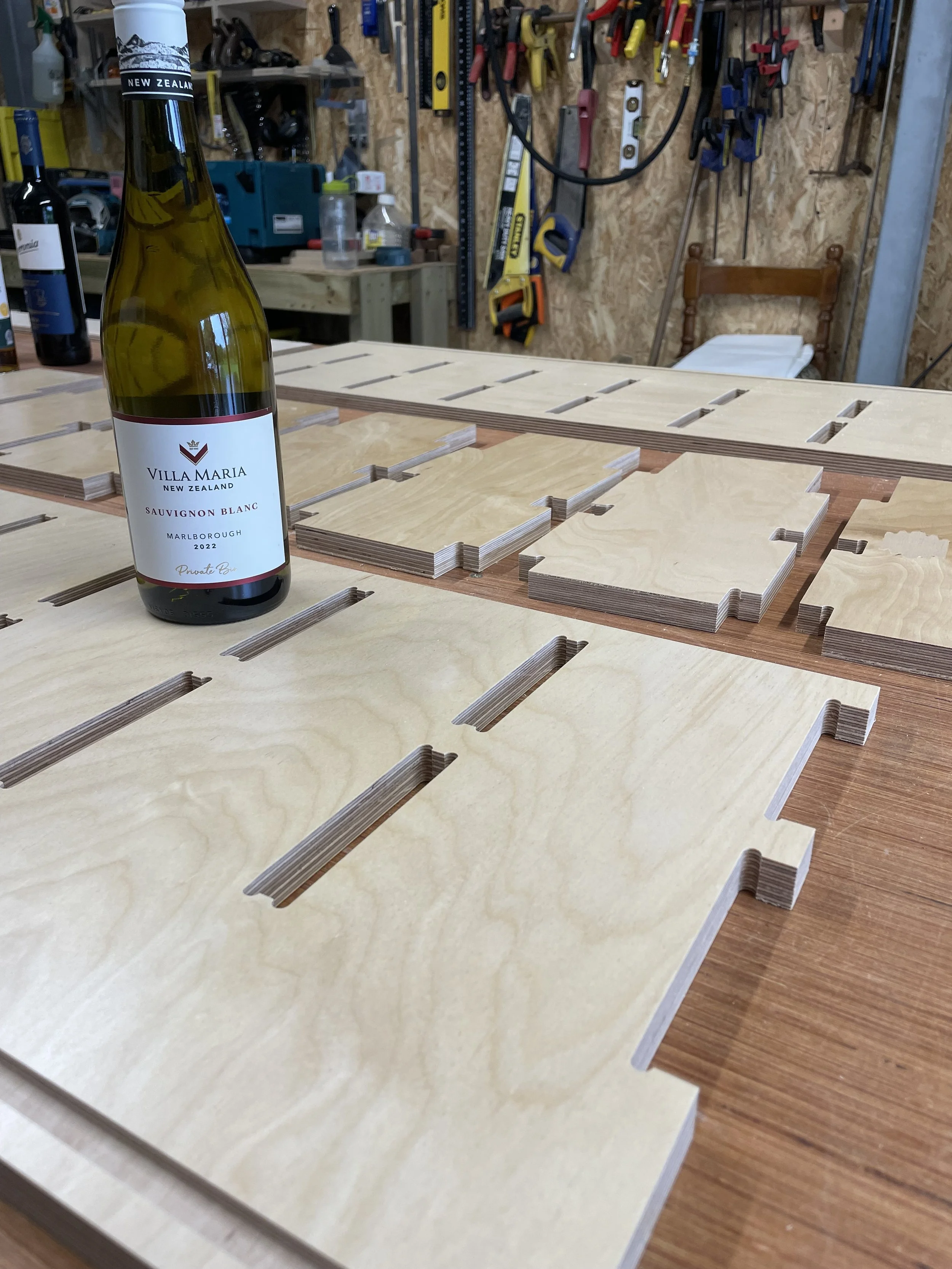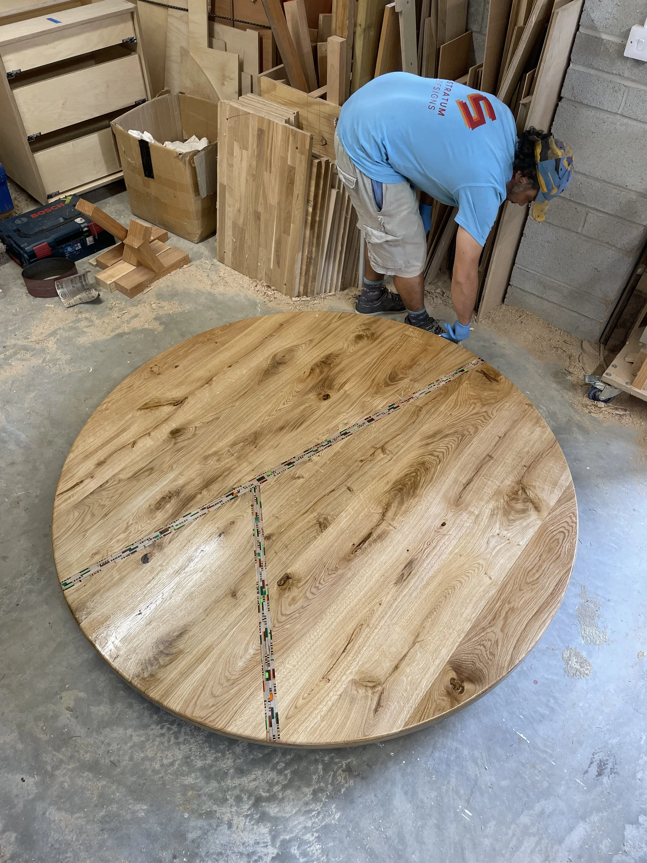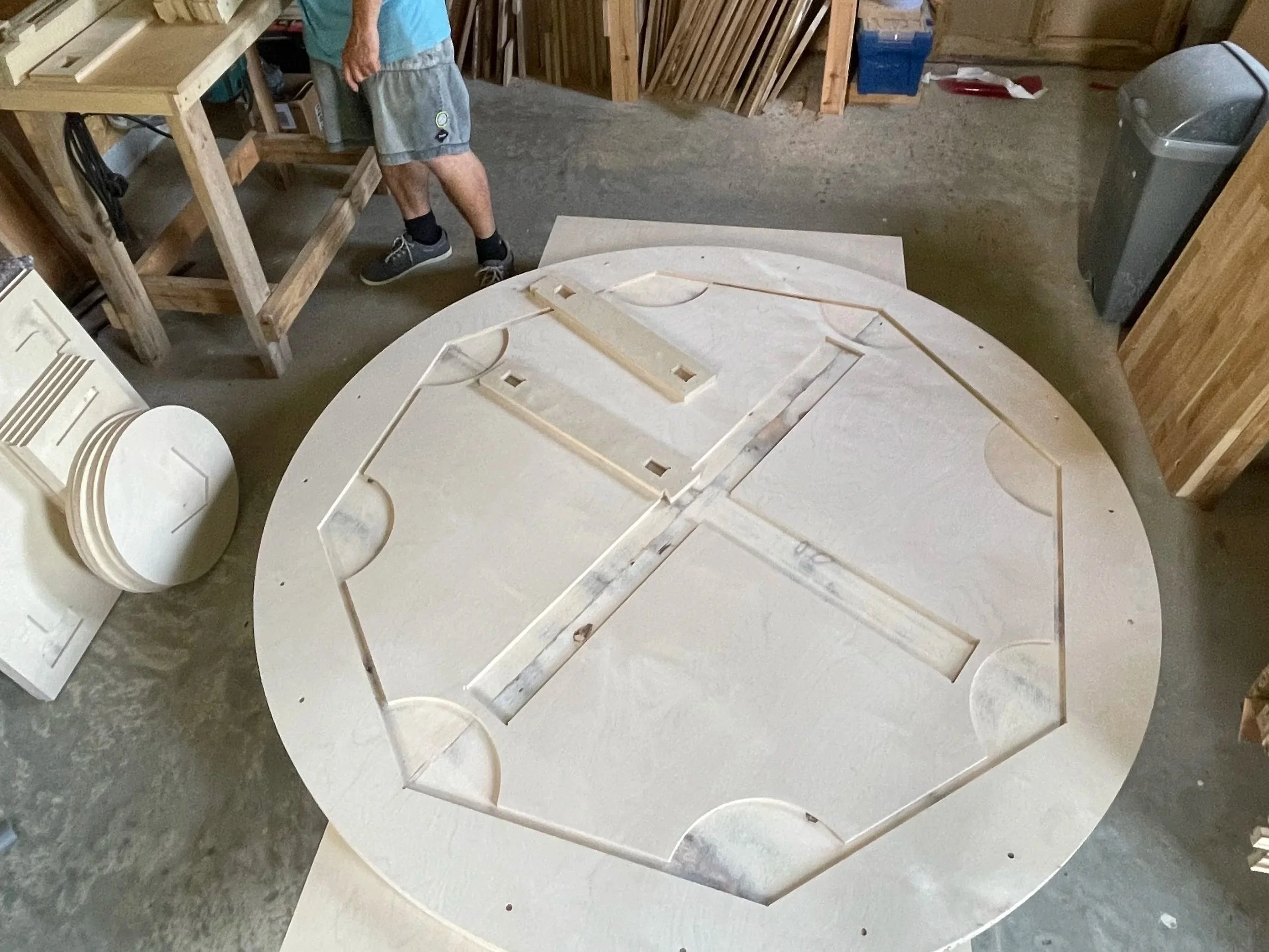 CNC cut pockets on the underside of the 8 seater table top. To receive the leg system